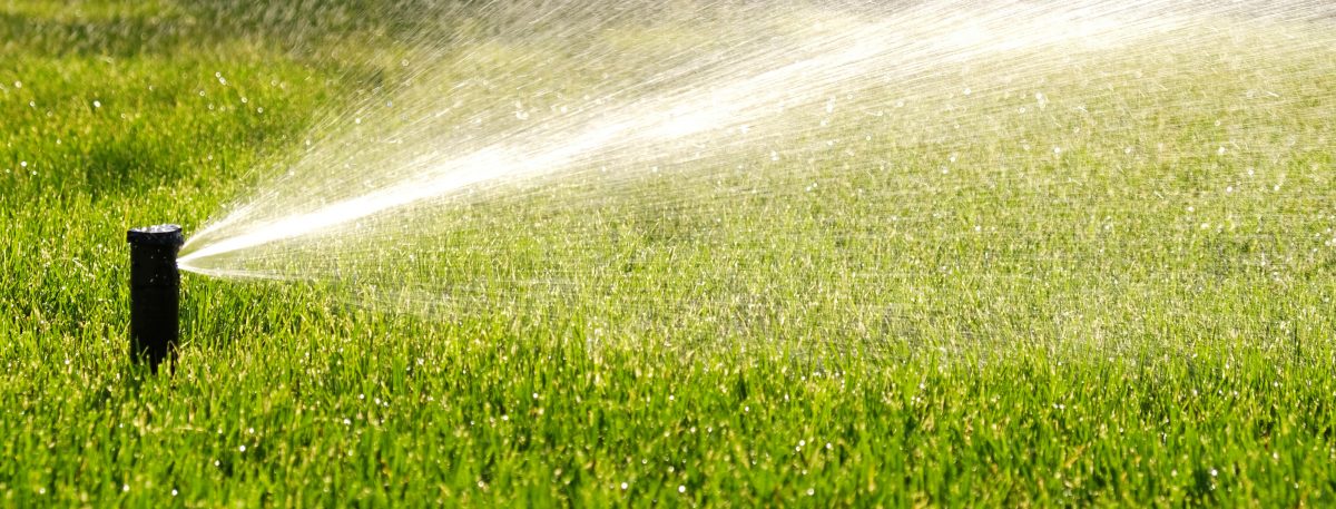 Automatic garden irrigation system watering lawn. Savings of water from sprinkler irrigation system with adjustable head. Automatic equipment for irrigation and maintenance of lawns, gardening.